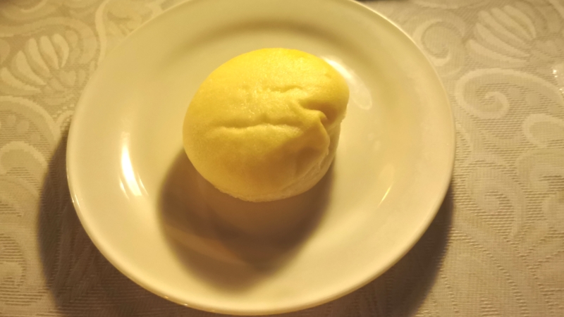デザートはマンゴーソルベです。夏なのに苺がのっていて、高級感がありました。